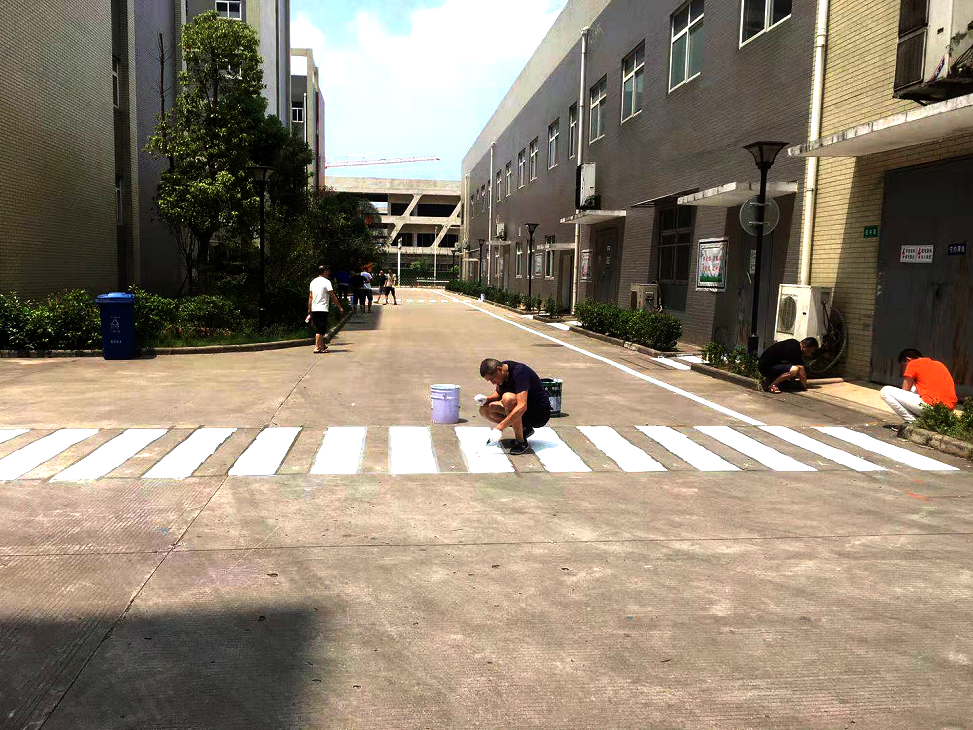早上7:30分不到,15名來自生產(chǎn)、倉庫、營銷的志愿勞動員工就已經(jīng)齊聚在早會集合點,高總來了,彭總來了,生產(chǎn)部張文鋒經(jīng)理也來了。在高總對劃線任務(wù)、要求、關(guān)鍵節(jié)點進行安排部署后,大家開始分工合作:地面清掃、測量定位、膠帶標(biāo)線、油漆涂刷,沒有導(dǎo)向箭頭模板,制袋沈祥飛主管拿著紙板、卷尺到外面對著馬路上的交通導(dǎo)向箭頭裁減取樣、量取尺寸,就這樣,一道道工序,一個個節(jié)點去完成,雖手法業(yè)余但做得有模有樣、一絲不茍。頂烈日、冒高溫,大家熱情高漲、揮汗如雨換來的是我們眼前身后那筆直、整齊、漂亮的線條。經(jīng)過連續(xù)奮戰(zhàn)4個小時,圓滿完成當(dāng)天的路面劃線任務(wù)。
