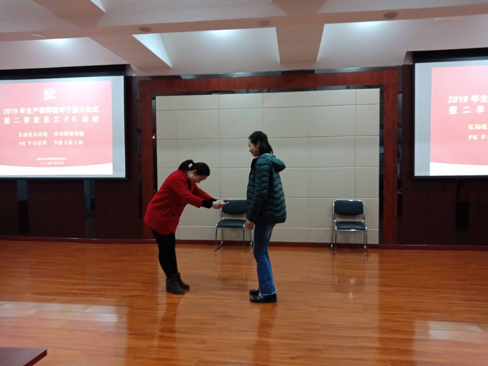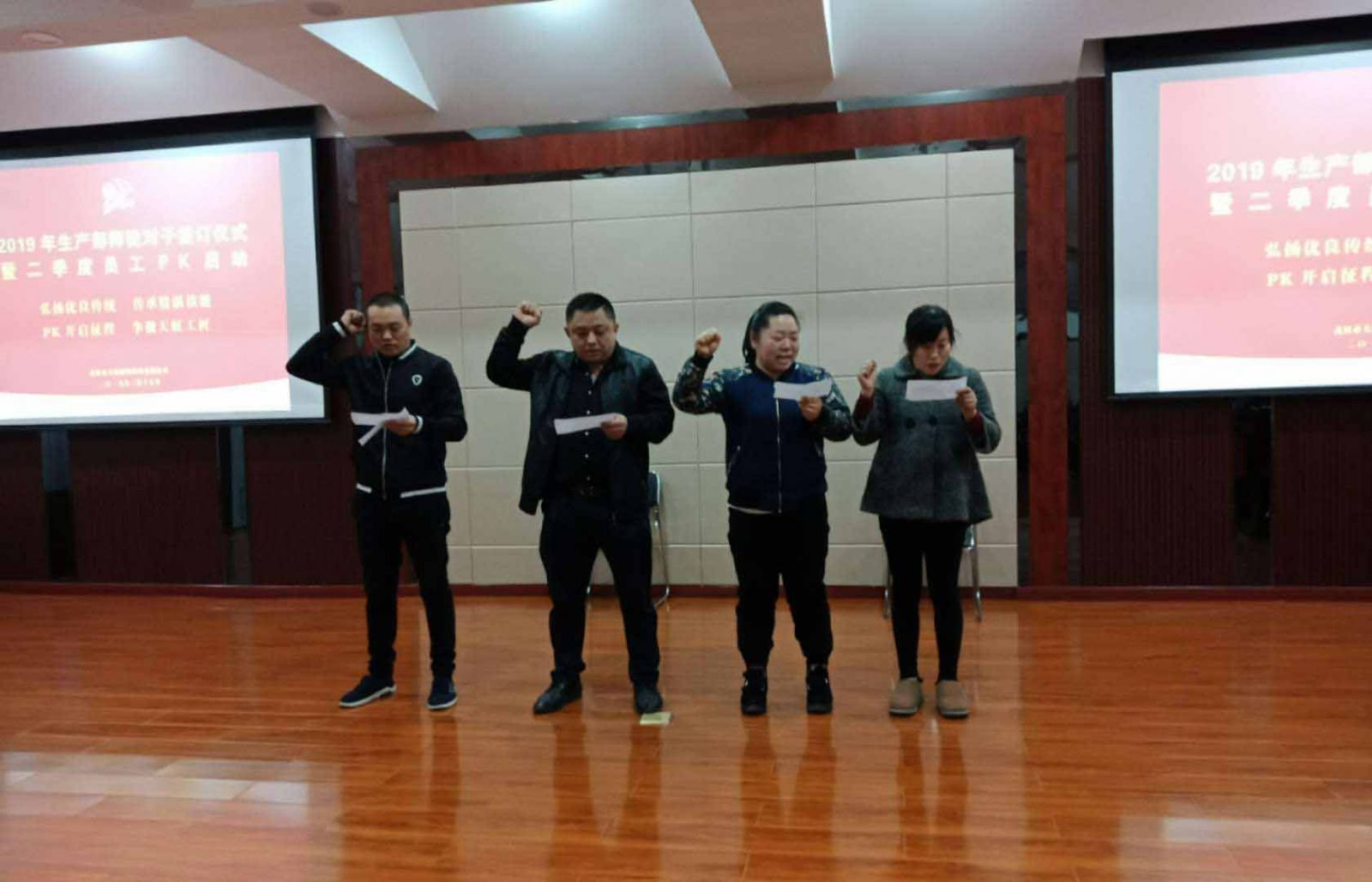 拜師的香茶仍溫,莊嚴(yán)的承諾余音繞梁,主持人緊接著又宣布2018年第四季度員工PK兌現(xiàn)和2019年第二季度員工PK啟動。員工PK是自2018年第四季度開始舉辦,旨在將產(chǎn)品品質(zhì)、產(chǎn)出率、節(jié)能降耗等生產(chǎn)目標(biāo)通過員工間、班組間進(jìn)行PK的形式進(jìn)行提升和達(dá)成。