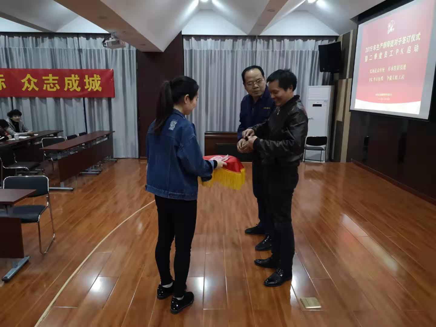 在活動現(xiàn)場,在公司總經(jīng)理陳志浩先生、營運副總馬少華先生、營銷副總高銀旺先生以及幾十名車間員工的見證下,共有10對師徒完成了拜師儀式和簽訂師徒對子協(xié)議,最后師徒們結(jié)對走上舞臺,作出莊嚴(yán)的承諾。